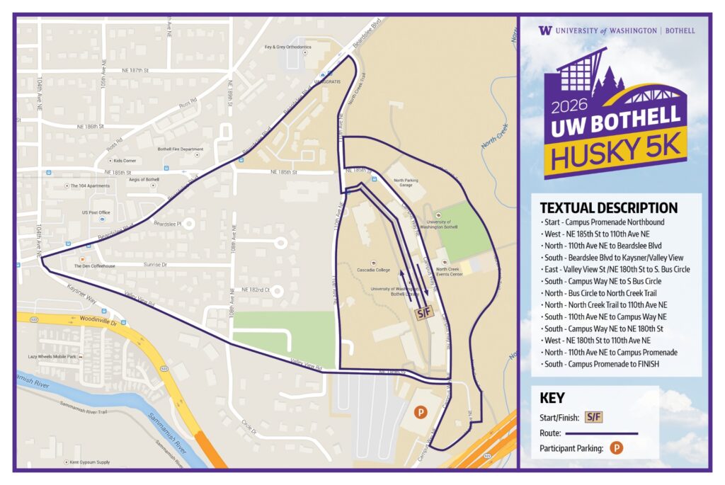 - Since parts of campus are closed for the race, visitors arriving by car should park in UW Bothell’s South Garage and enter campus via the south entrance at WA-522.