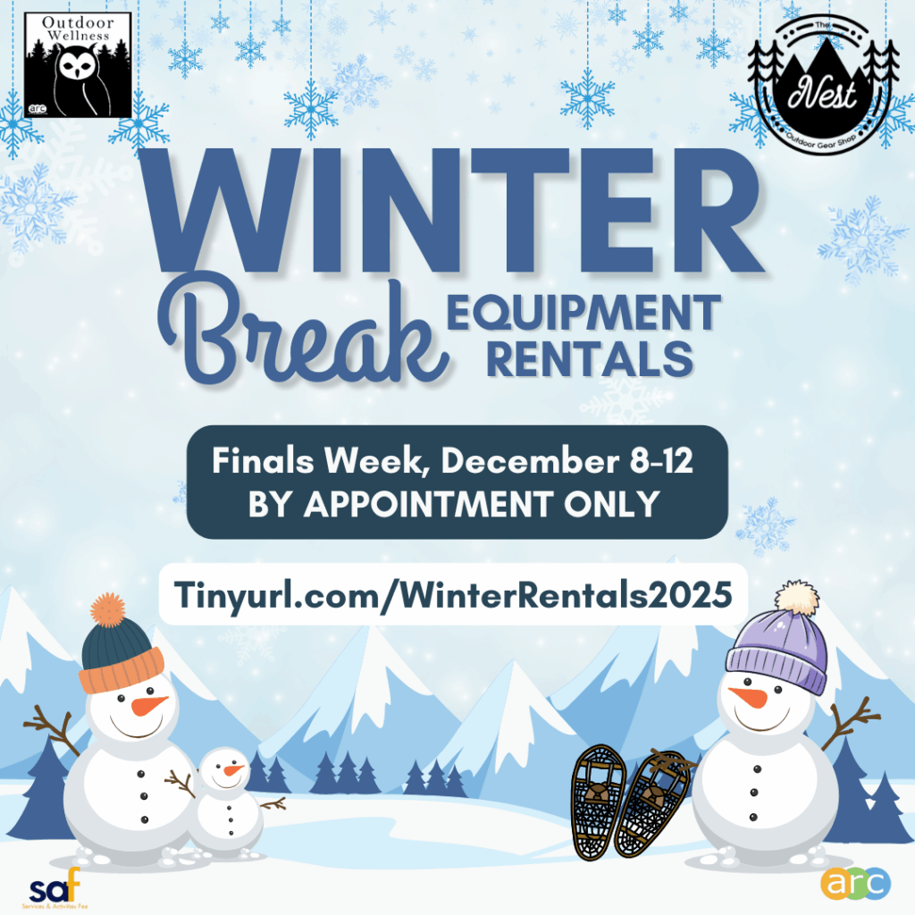 Planning on going on some snowy adventures during Winter Break? Sweet! Let us help you get geared up! Make an appointment for finals week (December 8-12, 2025) by going to https://tinyurl.com/WinterRentals2025 (no drop-in hours available – you must make an appointment). We have snowshoes, snow jackets, snow pants, microspikes, crampons, and more! We can’t wait to hear about the epic journeys you plan to embark on with our equipment