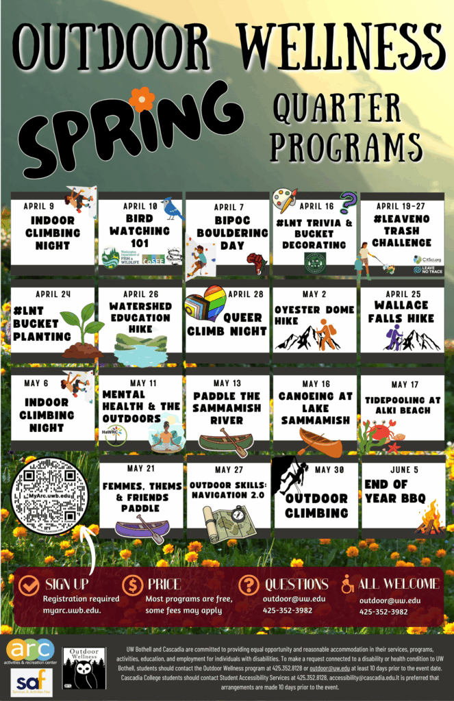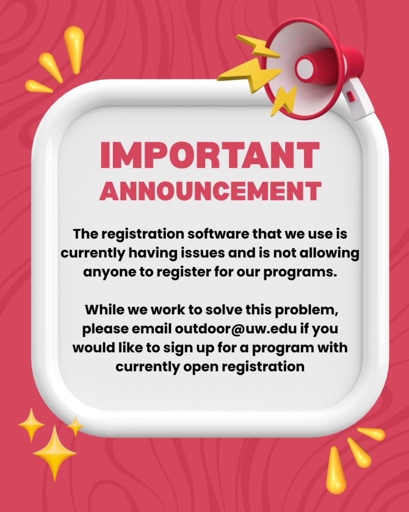 It has come to our attention that the registration software we use is currently not allowing anyone to register for our programs. While we work to solve this issue, we ask that if you would like to sign up for a program with currently open registration that you email us at outdoor@uw.edu. We apologize for any inconvenience, and we hope to get this issue resolved soon.