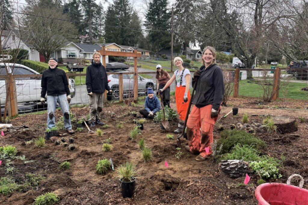Three yards in Finn Hill were prepped and planted in a 2-day “plantathon” on March 15th and 16th! Our first stop at Gary’s house had history; the planting location was once a driveway and then a lawn, which Gary had removed to reveal compacted, rocky, clay-rich soil. After the land was tilled and amended, we weeded, sheet mulched, relocated rocks and planted over 100 plants, extending the nearby habitat.You might spot the new planting if you enjoy walking on 72nd Ave.