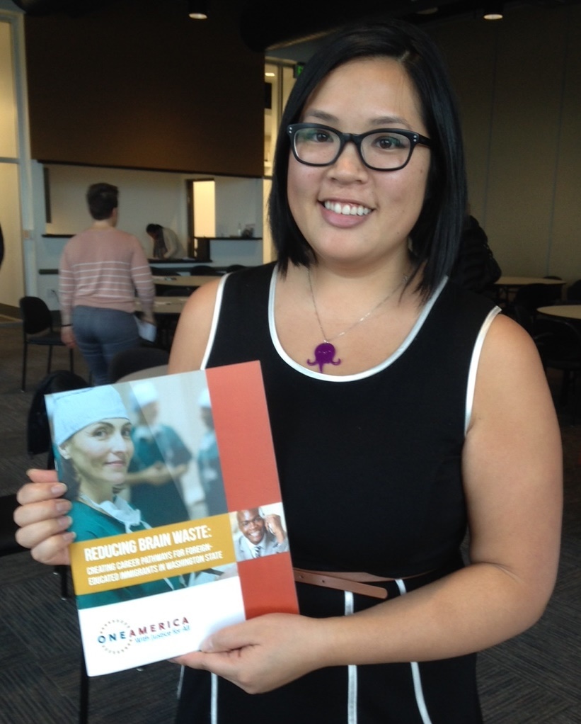 In her role as Policy Associate at OneAmerica, Vy Nguyen (’12, MA in Policy Studies) has focused the past year on workforce and education issues related to immigrant integration, particularly the issue of brain waste among foreign-educated immigrants. Many immigrants and refugees – engineers, doctors, nurses, scientists, accountants, and teachers in their home countries – bring a wealth of knowledge and experience yet find it difficult to continue their professional careers in the U.S. Many can only find low-wage survival jobs, such as nannies, cashiers, security guards, and cab drivers, that do not put their degrees or full training and skills to use. This enormous underutilization of human resources has been dubbed “brain waste,” and OneAmerica’s report details the barriers that cause brain waste, its impact on Washington State, and strategies for strengthened economic integration.