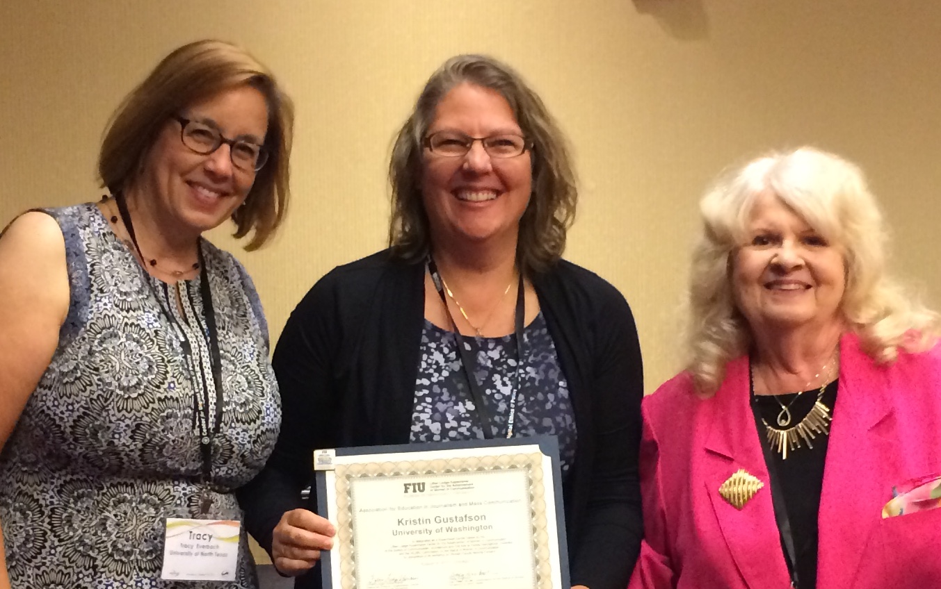 IAS faculty member Kristin Gustafson was selected as one of the 2017 Kopenhaver Center Fellows and then participated in the fifth annual Women Faculty Moving Forward Workshop, Surviving and Thriving in the Academy. The workshop was held at the AEJMC Convention in Chicago. Cosponsored by the Center and the AEJMC Commission on the Status of Women, the fellowship offers the workshop's leadership training in the academy alongside yearlong mentoring. Gustafson is pictured with the workshop's co-coordinators, Tracy Everbach, University of North Texas, and Lillian Lodge Kopenhaver, Florida International University.
