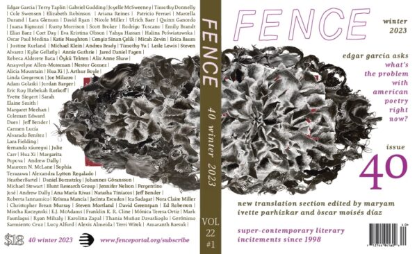 The 40th issue of Fence, a biennial magazine of poetry, fiction, art, and criticism that since 1998 has published "challenging writing distinguished by idiosyncrasy and intelligence rather than by allegiance with camps, schools, or cliques," is full of wonderful and innovative work.