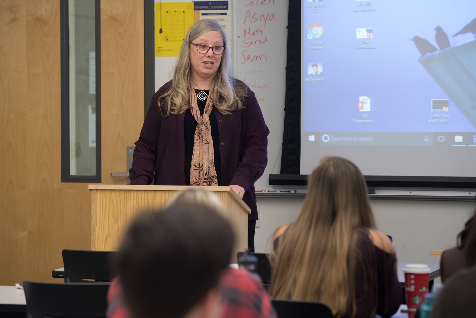 Rep. Shelley Kloba, whose 1st District includes Bothell and Kirkland, spoke about climate change to a class taught by lecturer Heather Galindo in the School of Science, Technology, Engineering & Mathematics.