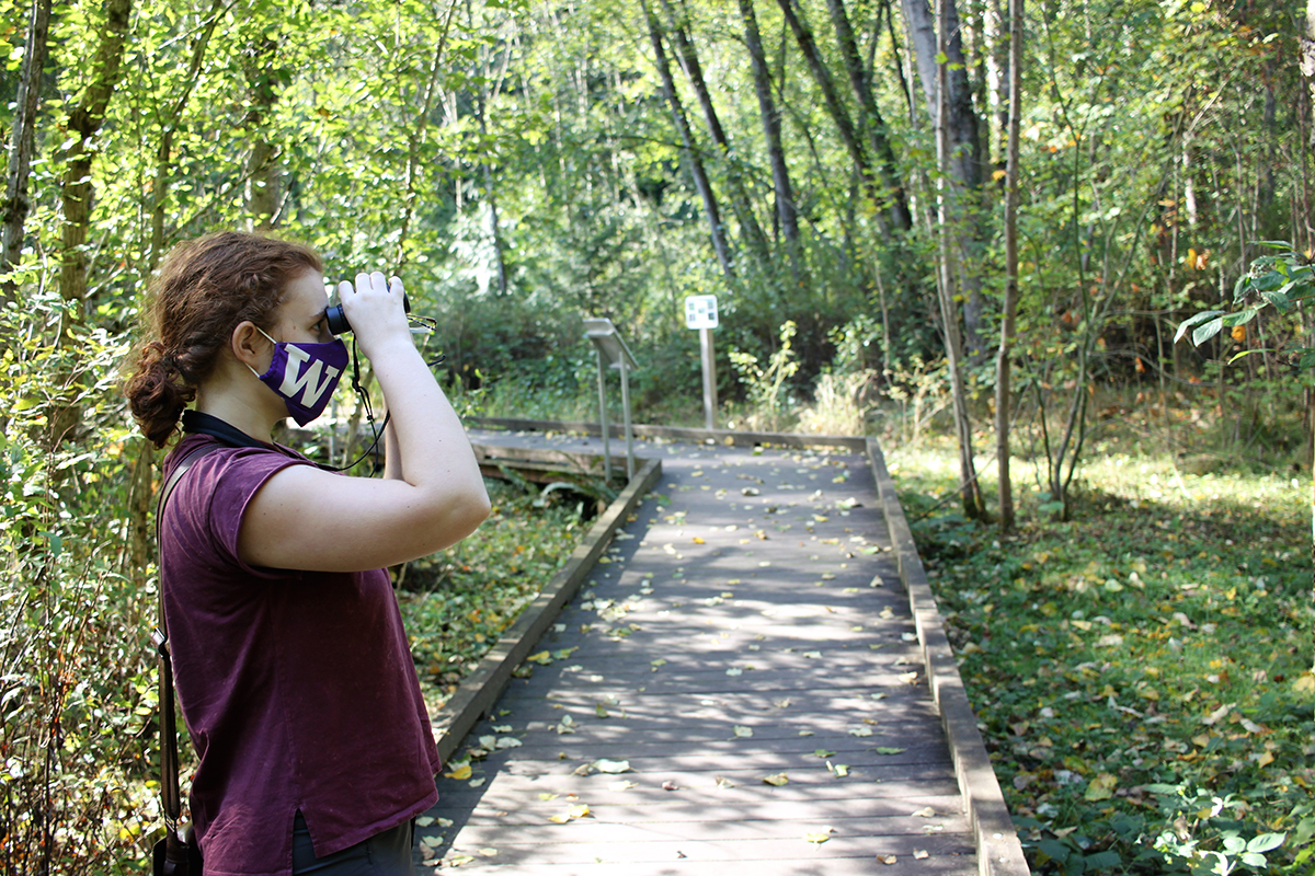 Kira Lemke, a sophomore majoring in Biology, surveyed bird life in Lake Forest Park as part of research led by Douglas Wacker, assistant professor in the School of STEM. Photo by Doug Wacker.