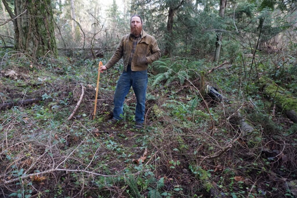 With Stokes as his adviser, he gained funding through UW Bothell’s Office of Sponsored Research for a project to dig for the answers. Church returned to a section of forest at the park with a new mission: Meticulously quantify the vegetative cover of all native understory species under (and near) a sample of large English holly trees. Unlike the first project, he would investigate the potential impact of invading holly on other species.