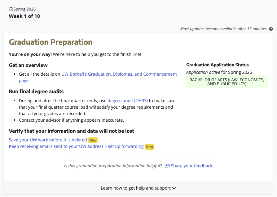 When your application has been processed by the Office of the Registrar, you will see something like the following on your MyUW with the application quarter and year appearing on the right-hand side of the page: