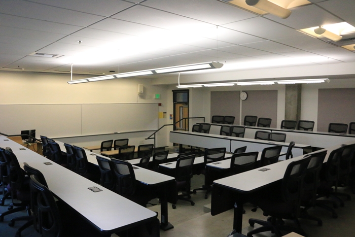 Tiered Floor classrooms are configured in a U-shape with affixed tables, and chairs that could move if needed, while others are auditorium style with fixed seating. Tiered classrooms contain: