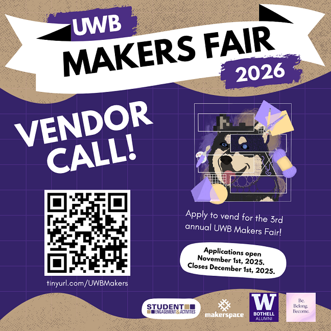 Don’t miss the 3rd Annual UWB Makers Fair on February 11, 2026. This is a celebration of our community’s creative talents and uniquely-made creations. Last years Fair featured 80+ student, faculty, staff, alumni, and community makers. From handmade crafts to desserts, we are gathering everyone to inspire one another, to explore, to share, and to support the creative and entrepreneurial spirit of our community! All are welcome! Show some love for our makers! If you are interested in being a vendor, application will open November 1, 2025 and close December 1, 2025.